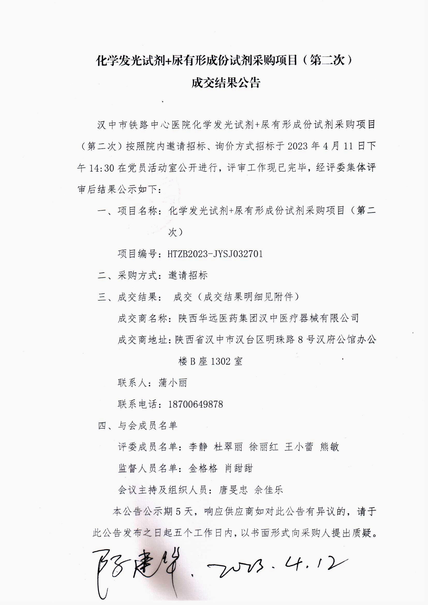 化学发光试剂+尿有形成份试剂采购项目(第二次)成交结果公告