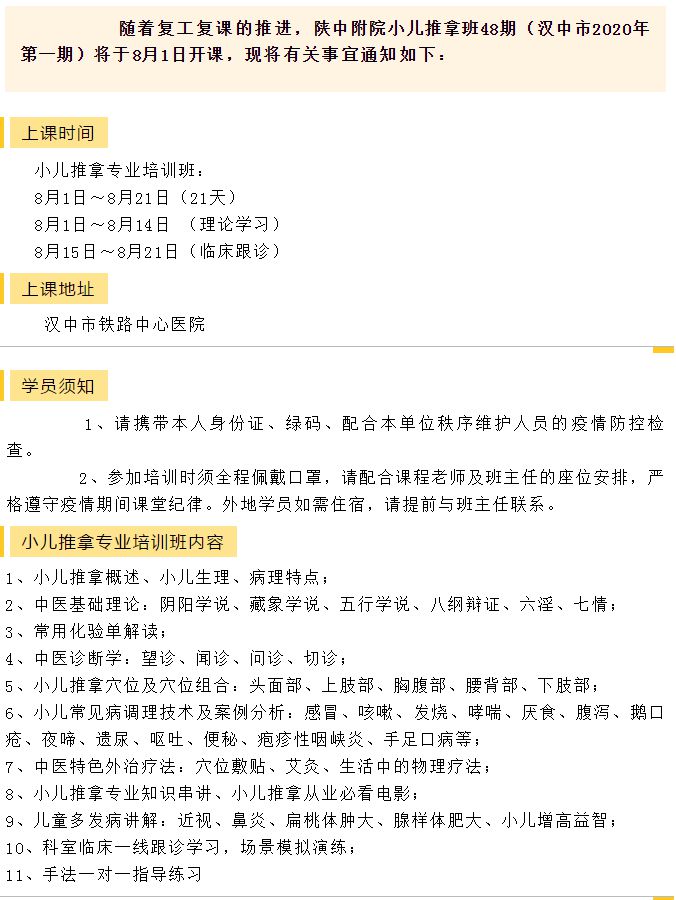 陕中附院小儿推拿班48期(汉中市2020年第一期)开课通知