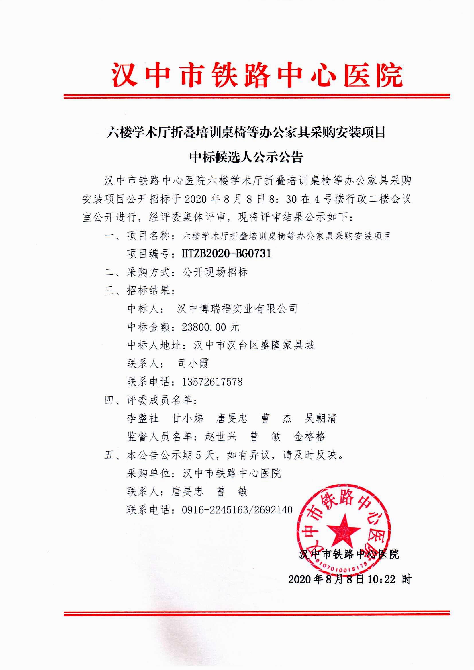 六楼学术厅折叠培训桌椅等办公家具采购安装项目中标候选人公示公告