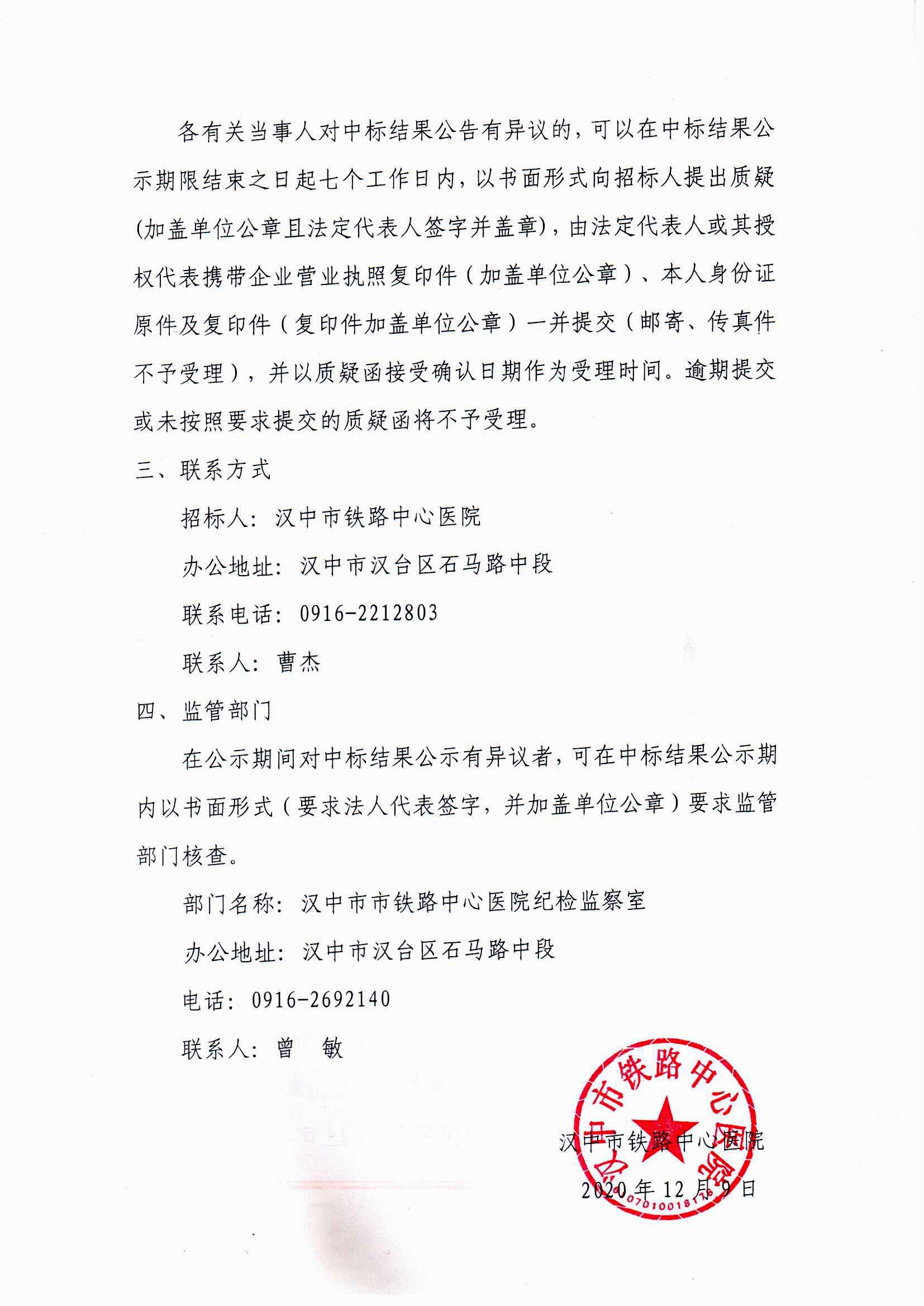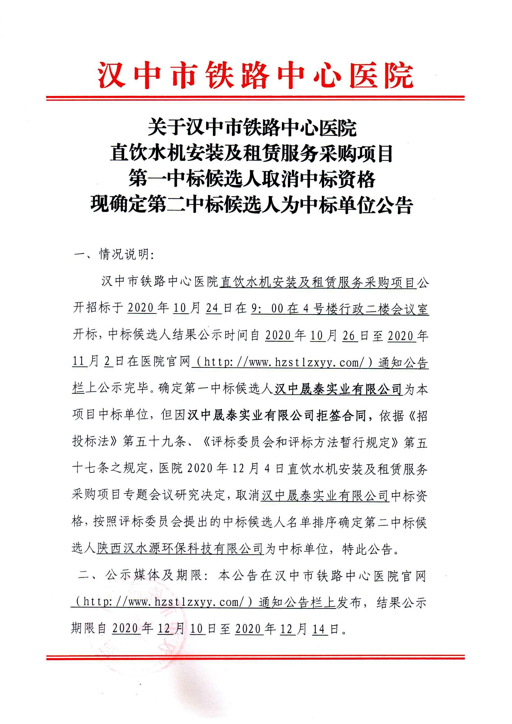 关于汉中市铁路中心医院直饮水机安装及租赁服务采购项目第一中标候选人取消中标资格现确定第二中标候选人为中标单位公告
