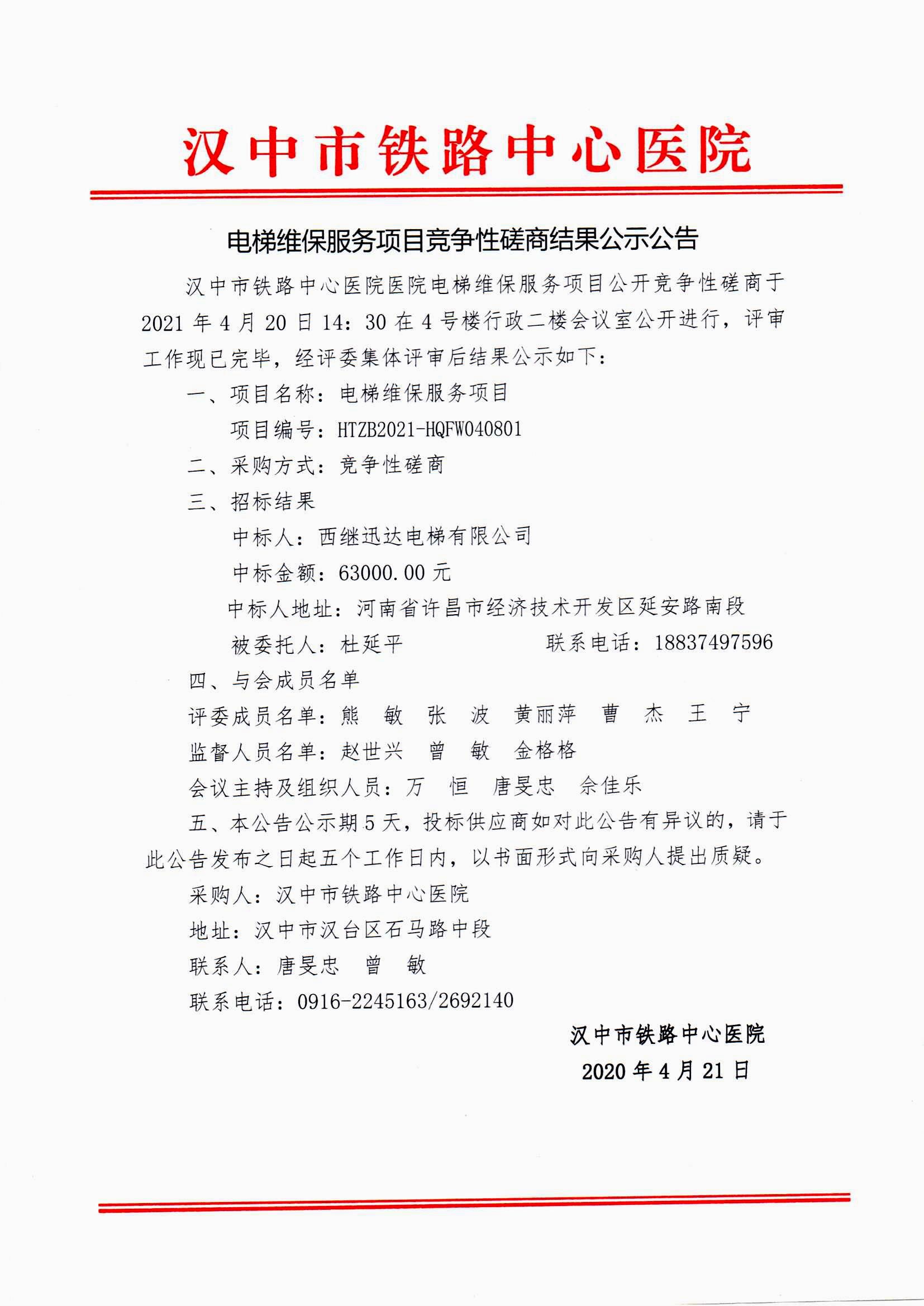 电梯维保服务项目竞争性磋商结果公示公告