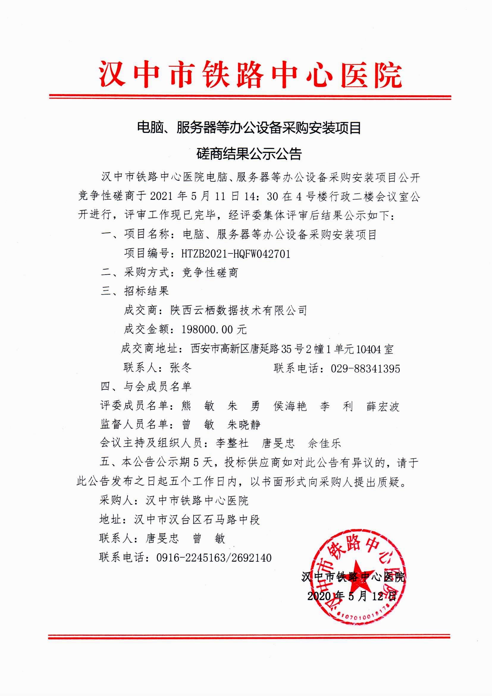 电脑、服务器等办公设备采购安装项目磋商结果公示公告
