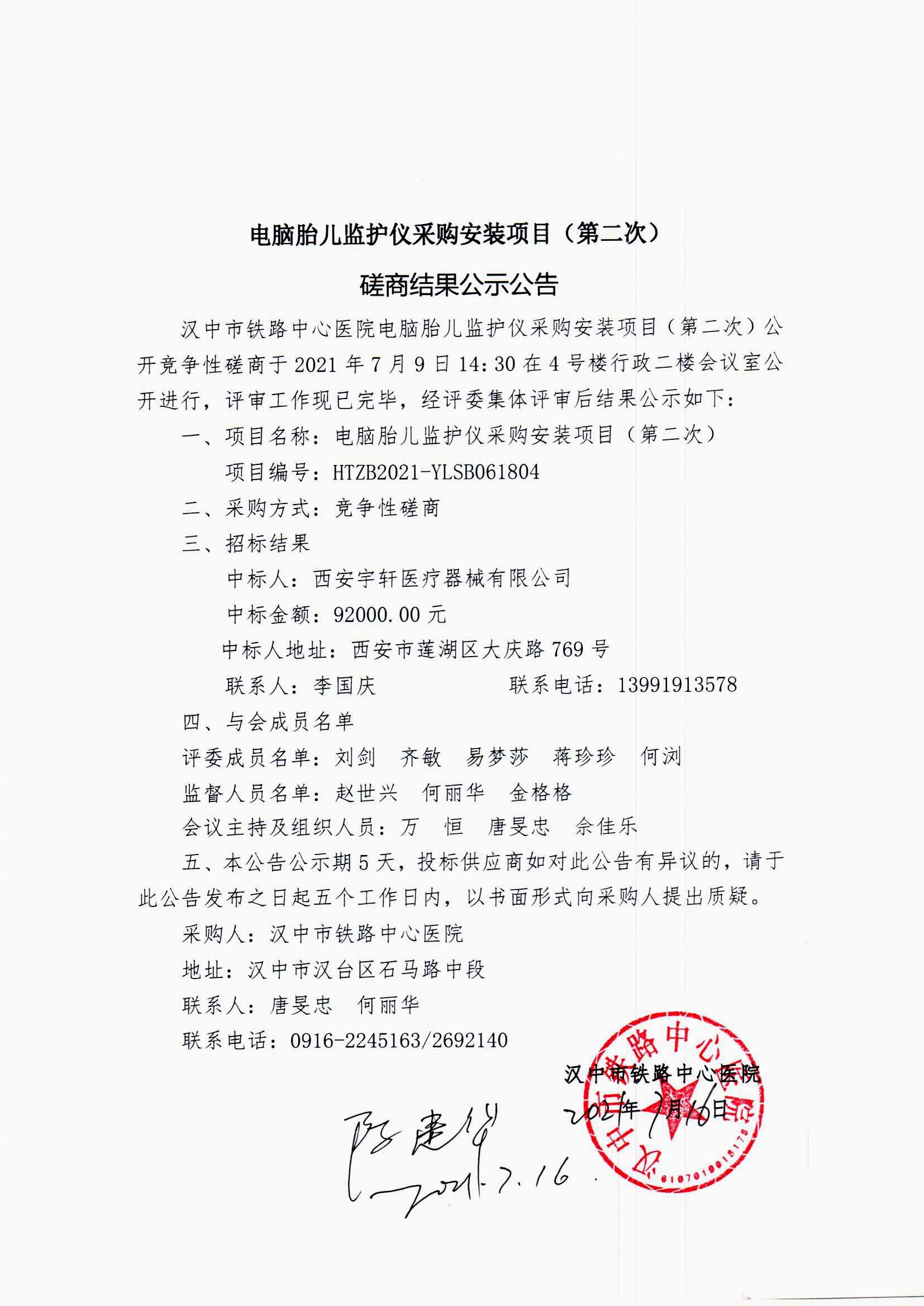 电脑胎儿监护仪采购安装项目(第二次)磋商结果公示公告