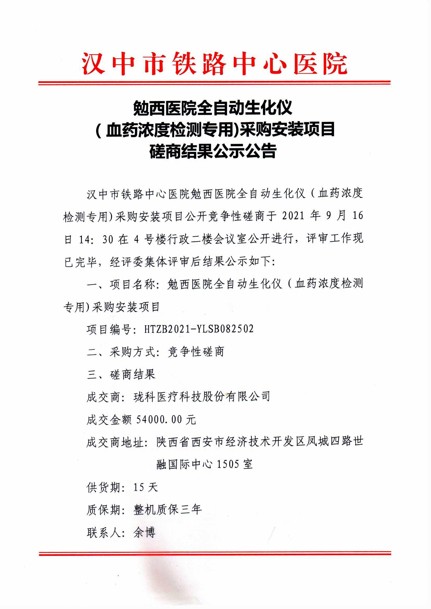 勉西医院全自动生化仪(血药浓度检测专用)采购安装项目磋商结果公示公告