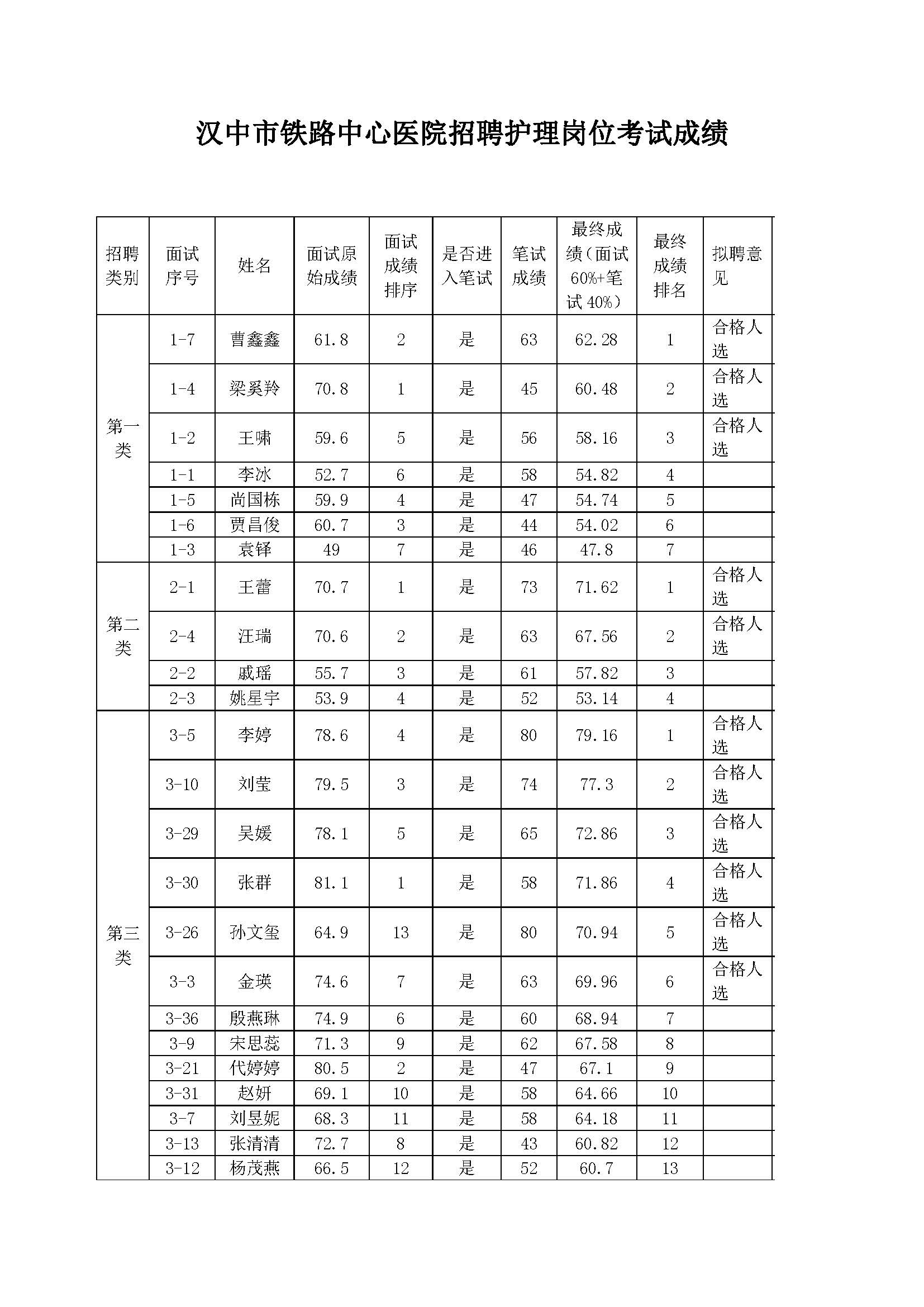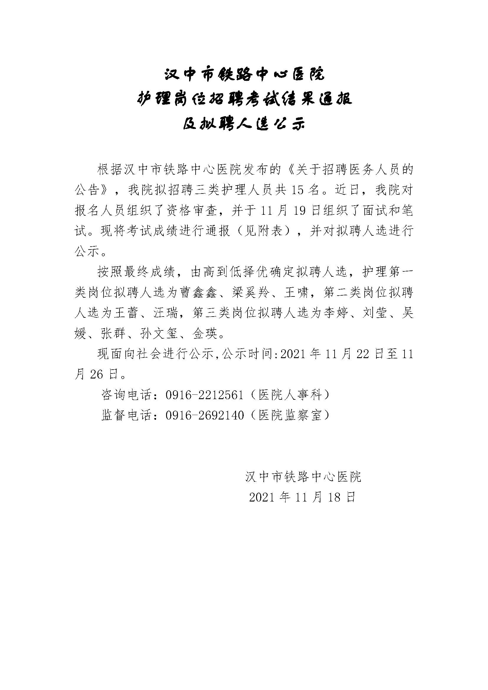 汉中市铁路中心医院护理岗位招聘考试结果通报及拟聘人选公示