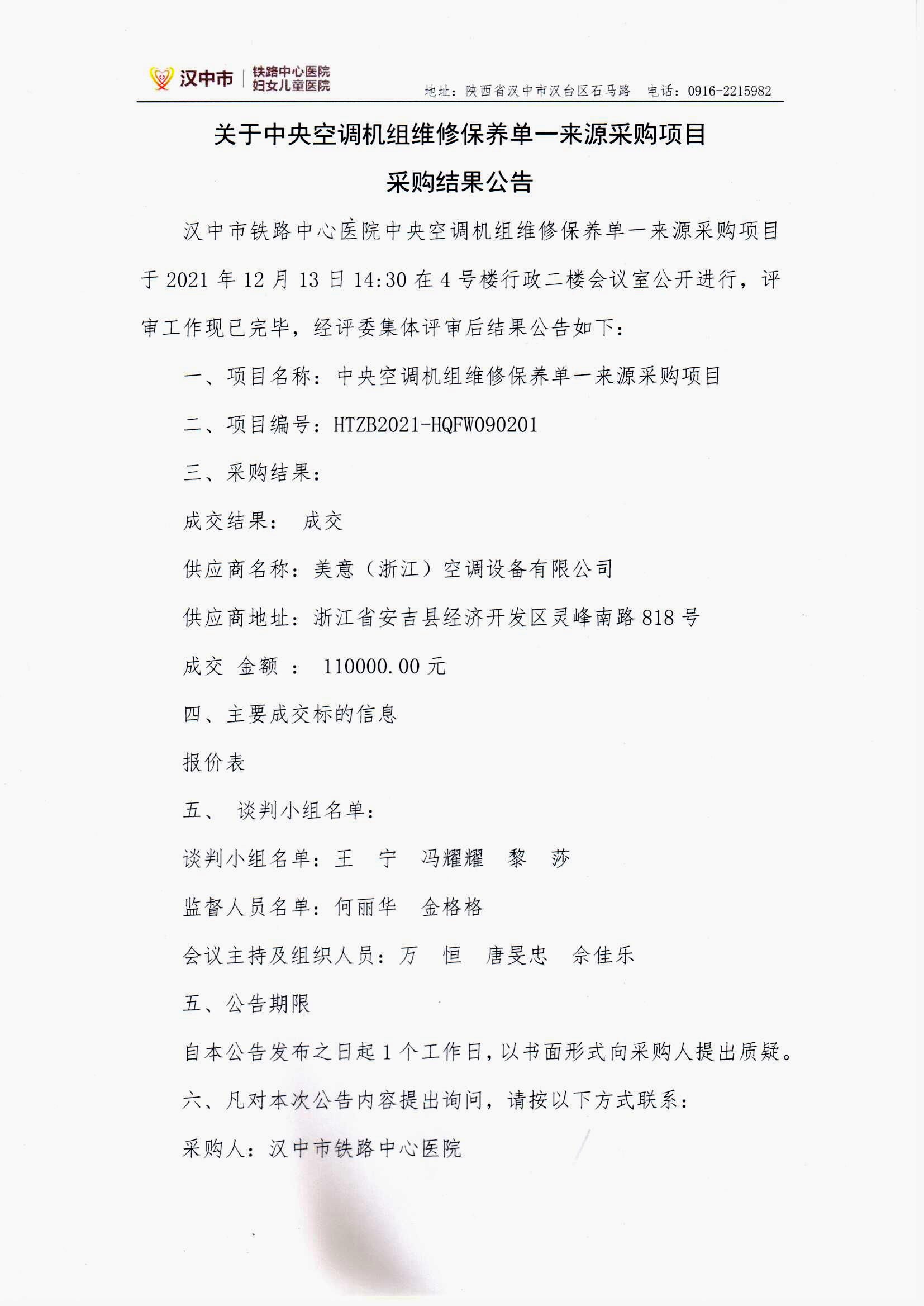 关于中央空调机组维修保养单一来源采购项目采购结果公示