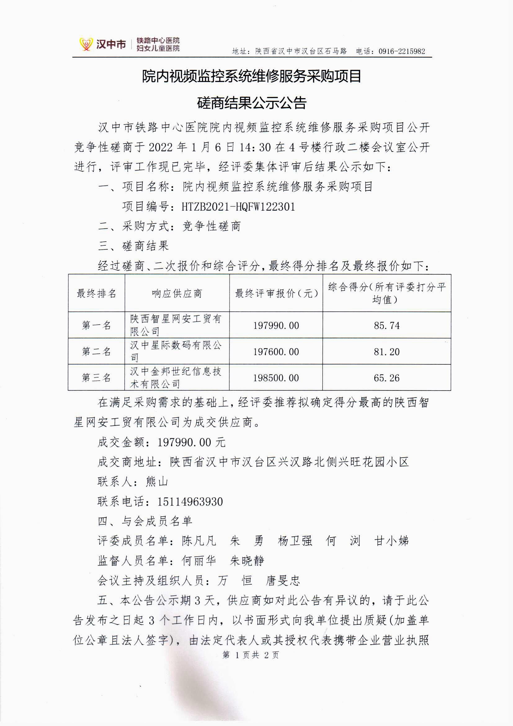 院内视频监控系统维修服务采购项目磋商结果公示公告
