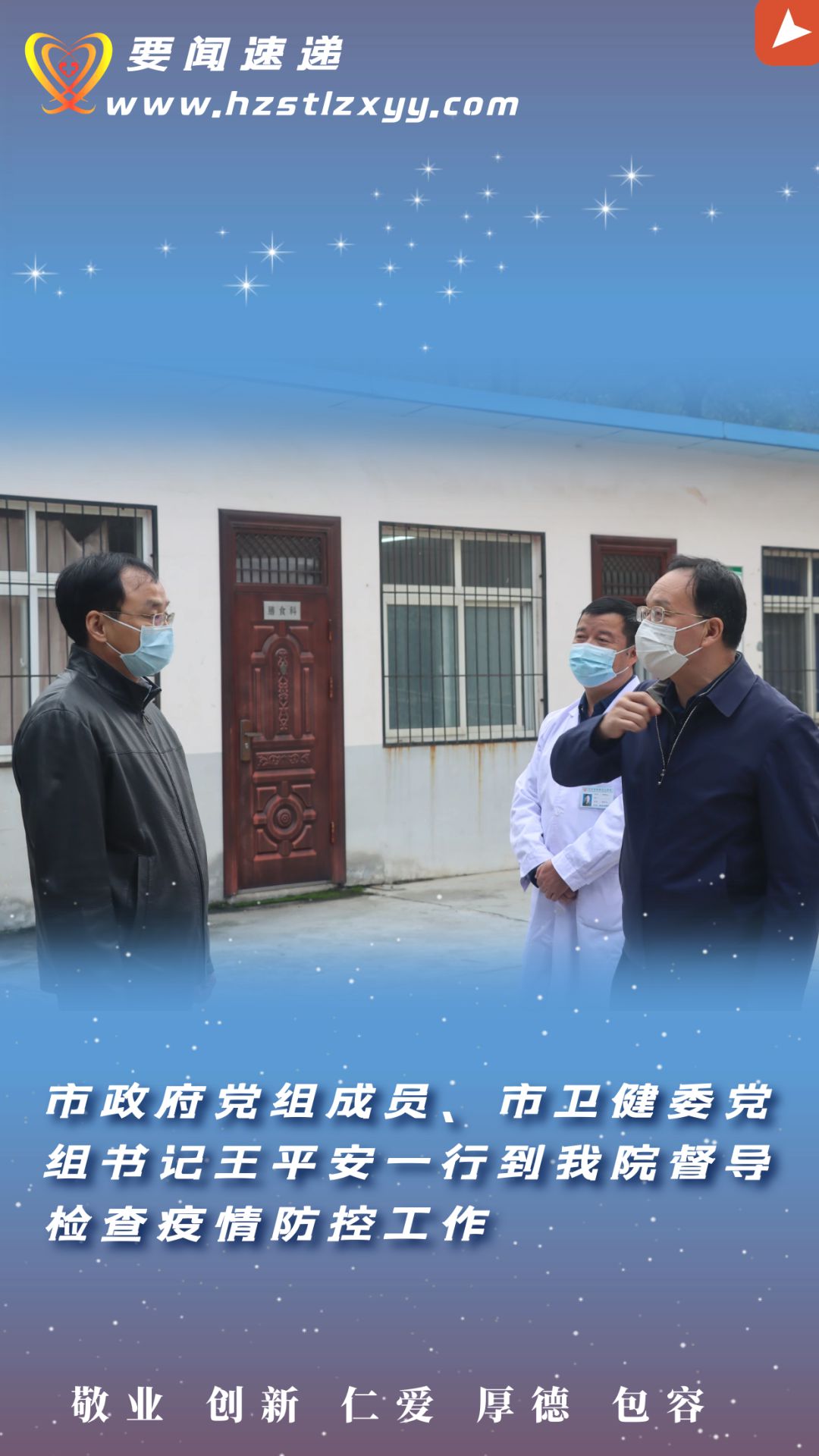 10月10日下午,市政府党组成员、市卫健委党组书记王平安、医政科科长张霄到我院督导检查疫情防控工作,院领导班子成员及相关职能科室负责人陪同检查。