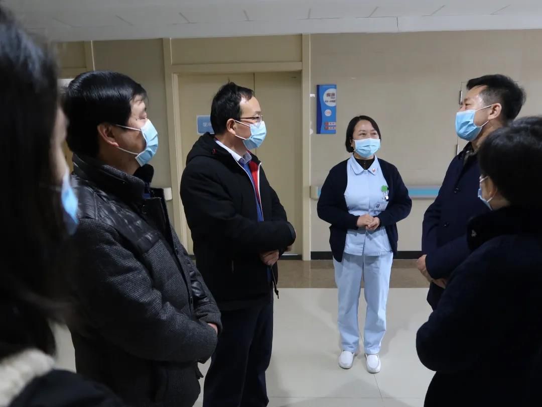 在神经内科,于局长一行仔细核查了住院患者和陪护人员的核酸检测情况及信息登记等,护士长杨桂春按照医院疫情防控要求,在病区门外向于局长汇报了科室严格落实病区门禁系统的管理,以及对住院病人及陪护人员的管理和严防输入所采取的管控措施。