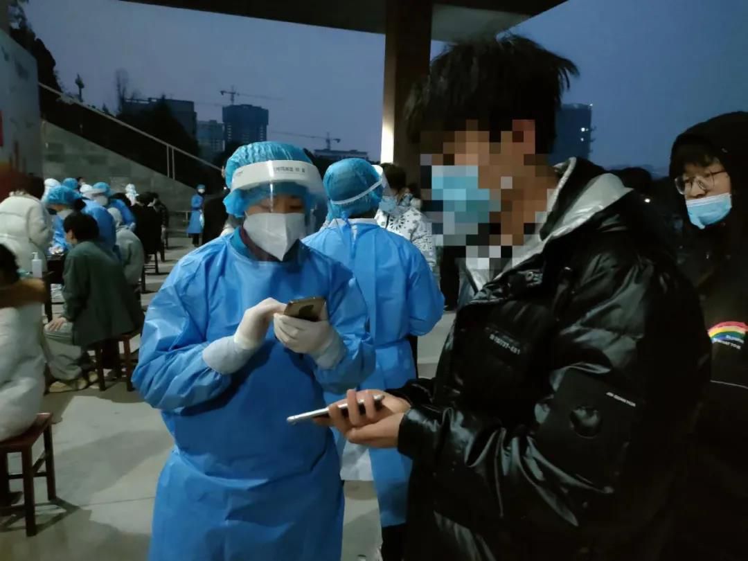 天色渐晚,采样组迅速整理好采样工具,穿戴好防护衣物,扫码组迅速也穿戴好防护衣物打开手机迅速进入工作状态。随着无数遍“来,抬头,张开嘴,啊~”,“请大家打开健康码或拿出身份证”,收获无数“谢谢”,“辛苦啦”学生们都为“大白”点赞。天寒地冻,护目镜结满水雾,手冻僵就搓一搓,脸上口罩深深的勒痕,都是冬日的最美的风景。