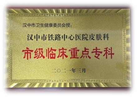 汉中市铁路中心医院皮肤科是汉中市卫健委临床重点专科,获7项国家级、3项省级(区域)、1项市级资质认证。是陕南地区规模较大、设备先进、技术精湛、集皮肤性病防治为一体的拥有独立病房的综合性科室,现有工作人员15人,医生5人,护士10人,其中高级职称3人,中级职称5人。
