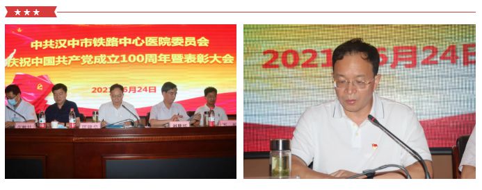 2021年6月24日下午,汉中市铁路中心医院在医院学术厅隆重举行“庆祝中国共产党成立100周年暨表彰大会”,全院领导班子、中层以上干部、全体中共党员、入党积极分子、发展对象共150余人次参加本次会议。会议由医院党委委员、纪委书记赵世兴主持。