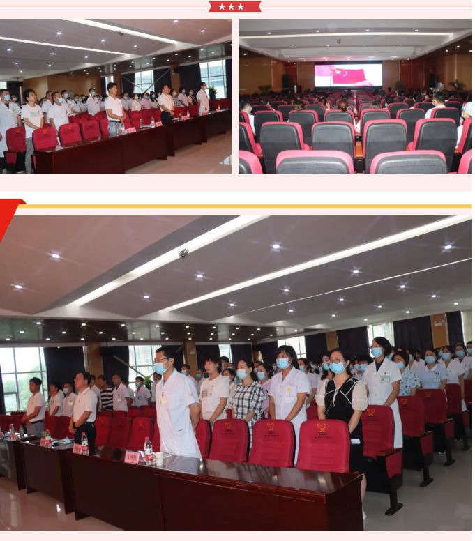 会上,全体与会人员起立,奏唱国歌,播放献礼短片《你,为什么入党?》,现场参会人员欣赏了精彩的文艺节目,疼痛科王仡天、刘冉朗诵《生命之光》,党群部宋纹青的独唱歌曲《不忘初心》,充分展示了我院职工对党的祝福和团结向上的精神风貌,同时,也让医务人员们重温中国革命的红色历程,将热爱国家、铭记党恩的情怀牢记在心。